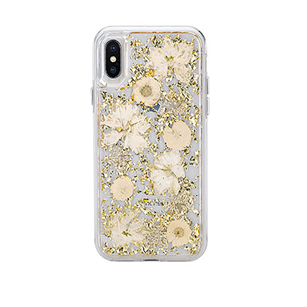 • Elegant dried flowers with eye-catching metallic elements are encased in clear resin to give this case a truly classy twist